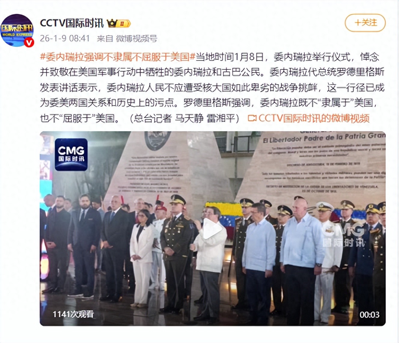 当地时间1月8日,委内瑞拉举行仪式,悼念并致敬在美国军事行动中牺牲的委内瑞拉和古巴公民。委内瑞拉代总统罗德里格斯发表讲话表示,委内瑞拉人民不应遭受核大国如此卑劣的战争挑衅,这一行径已成为委美两国关系和历史上的污点。罗德里格斯强调,委内瑞拉既不“隶属于”美国,也不“屈服于”美国。(总台记者 马天静 雷湘平)