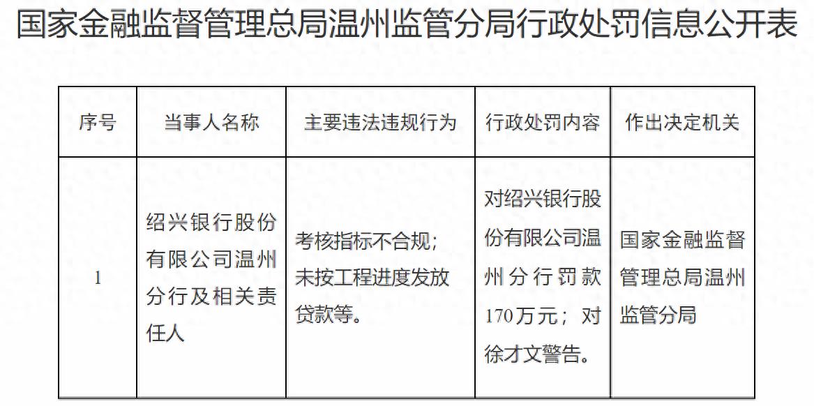 1月9日,国家金融监督管理总局温州监管分局发布的行政处罚信息显示,因考核指标不合规、未按工程进度发放贷款等,国家金融监督管理总局温州监管分局对绍兴银行股份有限公司温州分行罚款170万元,对相关责任人徐才文警告。