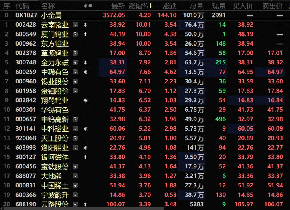 节后归来,钨价受多重利好因素共振提振:市场对节后补库需求的预期持续升温,钨原料现货供应维持偏紧格局,叠加多家钨冶炼企业相继上调长单报价,多重支撑下,钨价自1月6日起再度开启上行通道。此前黑钨精矿在2025年创下的460500元/标吨均价历史新高,也在1月7日至9日期间被连续突破,刷新历史价格纪录。需求端来看,AI、新能源、商业航天三大高景气赛道的需求放量,持续打开小金属品类的成长空间。此外,部分市场资金对有供给收缩预期的战略小金属的青睐等也带动小金属板块的飙升。截至1月9日10:36分,小金属行业大涨4.2%,个股方面:云南锗业、厦门钨业、东方钽业涨停,章源钨业、金力永磁、中稀有色、锡业股份、金钼股份、翔鹭钨业以及华锡有色等涨幅居前。