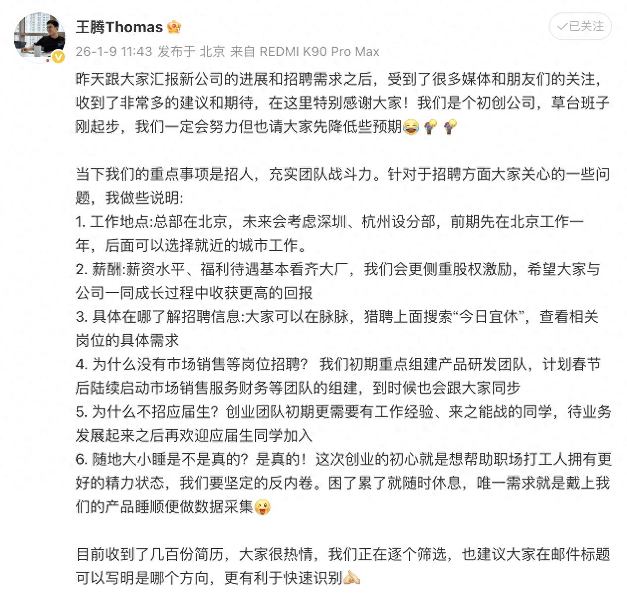 薪酬方面,王腾称薪资水平和福利待遇基本向大厂看齐,但会更侧重股权激励。