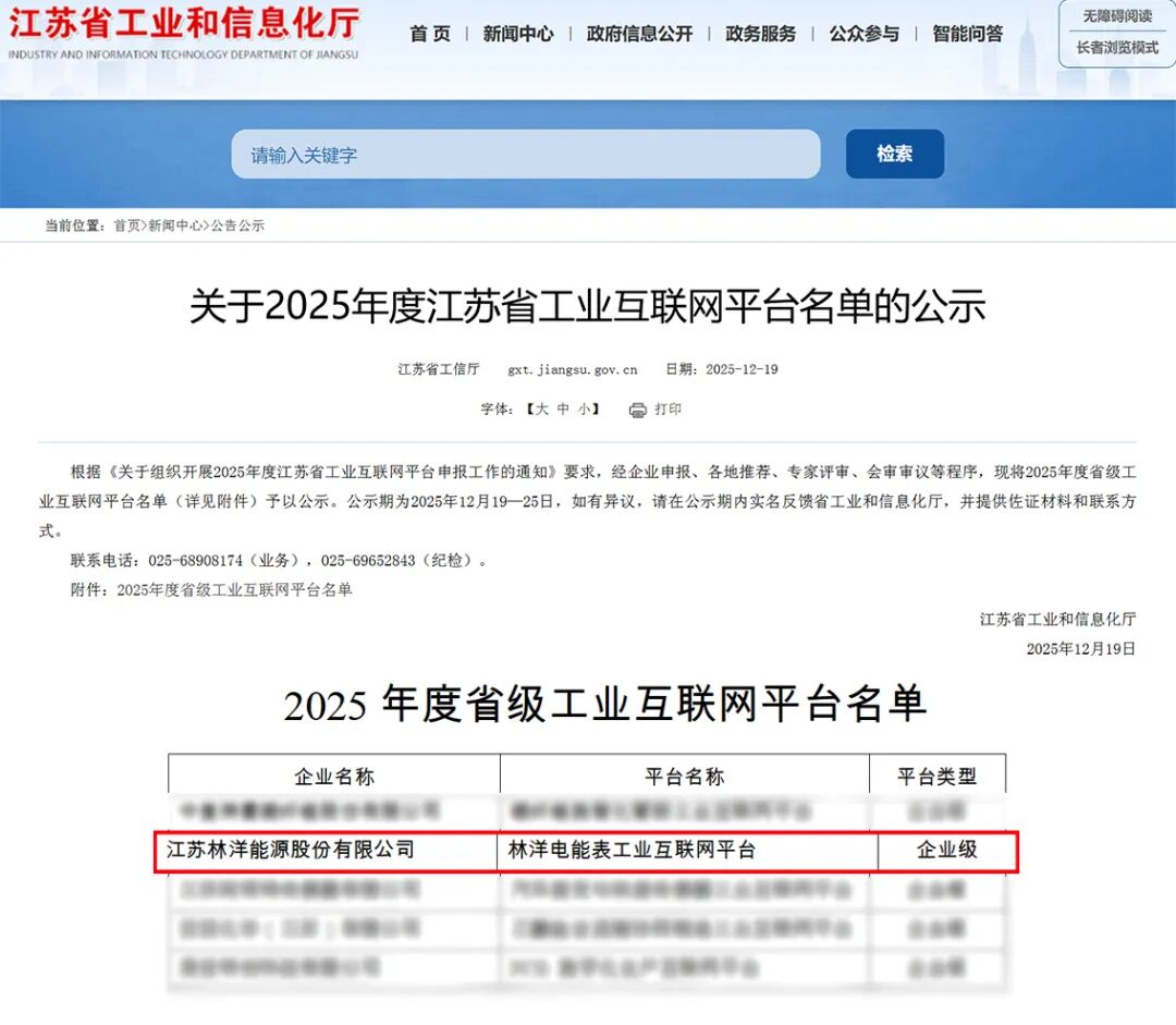 近日,林洋能源自主搭建的“林洋电能表工业互联网平台”,经江苏省工业和信息化厅严格评审,成功入选“2025年度江苏省工业互联网平台(企业级)”项目名录,全省共有50家企业获此认定。