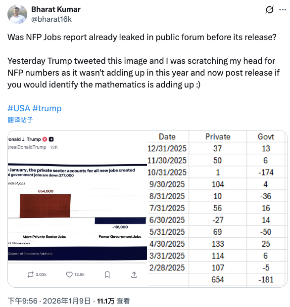 被称为“美联储传声筒”的Nick Timiraos表示,由于10月和11月的修正幅度颇大,很难说那张图表能带来何种程度的洞见。举例而言,去年2至11月的美国私营部门新增就业人数为68.7万,与特朗普的发的图对比,只能知道12月数据加前两个月调整累计减少了3.3万个岗位。