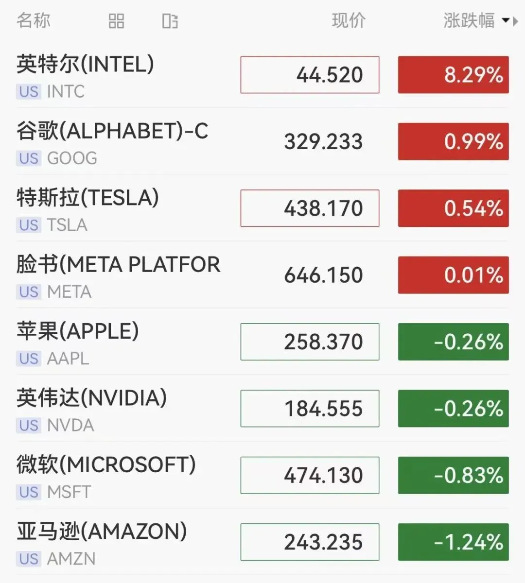 大型科技股涨跌不一,其中,英特尔涨超8%,创2024年4月份以来盘中新高。芯片股普涨,费城半导体指数涨超2%,阿斯麦涨超5%,美光科技涨超3%。