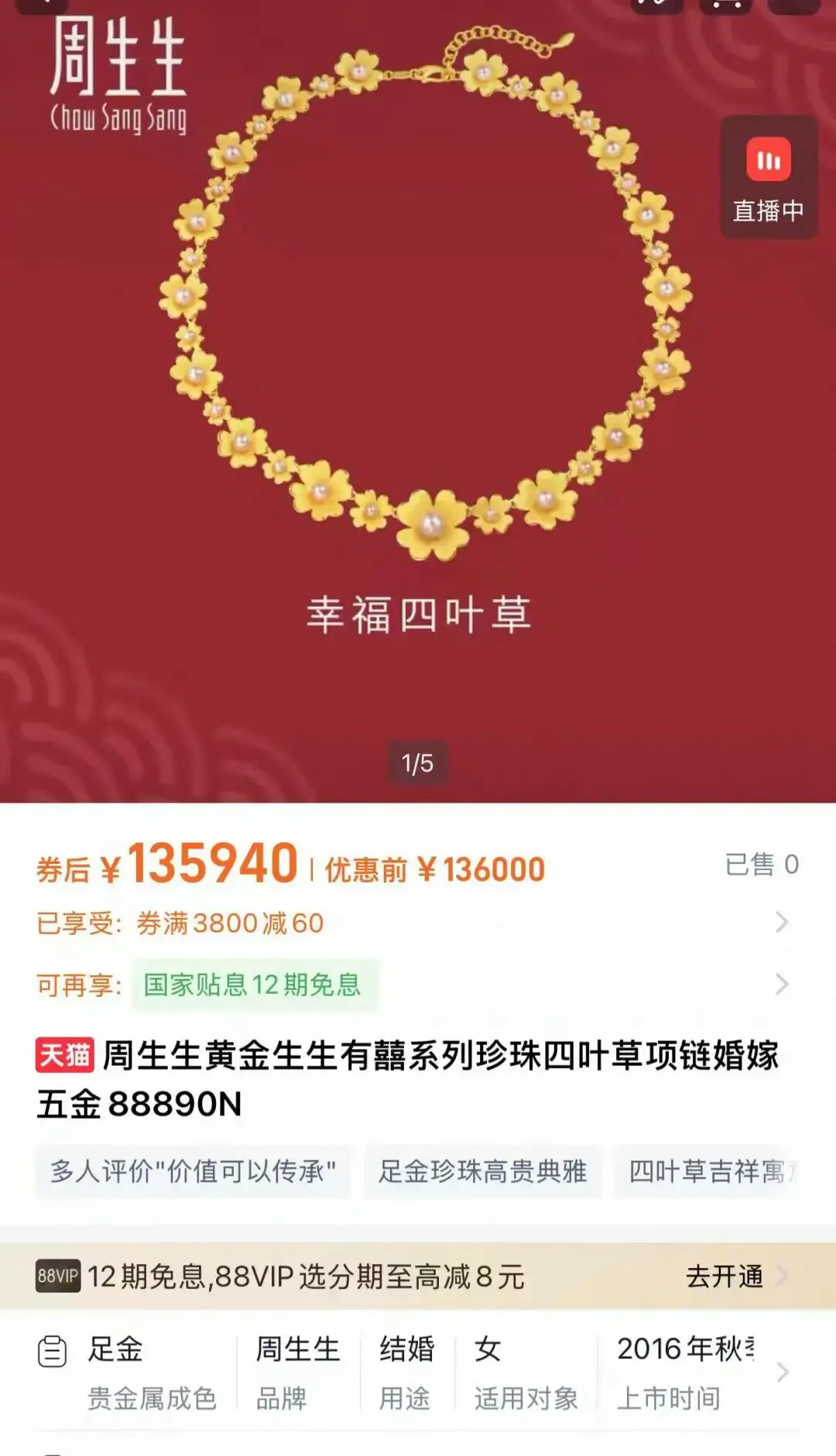 据界面新闻,1月9日,有网友发现,周生生天猫旗舰店里一件黄金生生有喜系列珍珠四叶草项链价格上调至136000元。