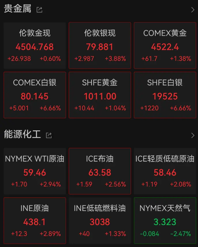 大宗商品方面,国际黄金价格短线拉升,现货黄金涨0.6%,报4504.76美元/盎司。