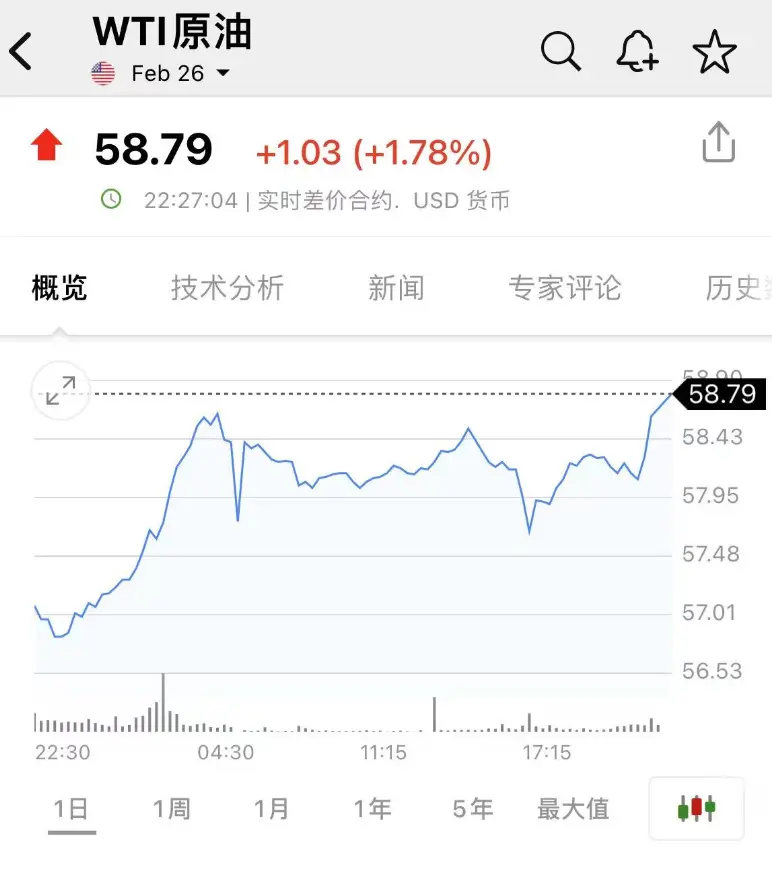 国际油价拉升,WTI原油涨1.78%,报58.79美元/桶;布伦特原油涨1.5%,报62.92美元/桶。