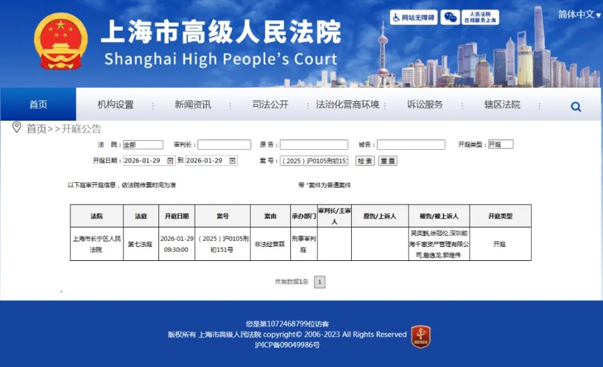 上海长宁区人民法院的开庭公告显示,千惠资产及相关成员因涉嫌非法经营罪被起诉,开庭时间定在2026年1月29日。