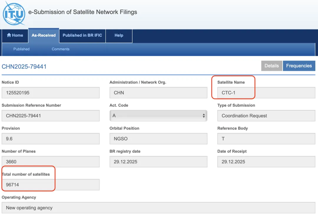 记者查询国际电信联盟(ITU)官网获悉,我国2025年12月向ITU申请了超20万颗卫星的频轨资源。