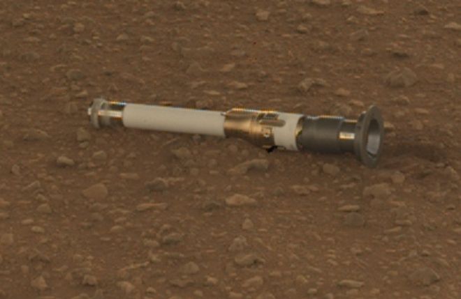毅力号火星车在火星表面的一个采样管看起来像一把光剑。图源:美国宇航局