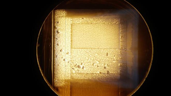 在位于加利福尼亚州的美国宇航局艾姆斯研究中心,一块 Avcoat 测试块在电弧喷射试验舱内接受热脉冲测试。该测试件配置有可渗透(上部)和不可渗透(下部)的 Avcoat 部分,以便进行比较,有助于确认阿尔忒弥斯 1 号探测器上 Avcoat 材料烧焦脱落的根本原因。图源:美国国家航空航天局