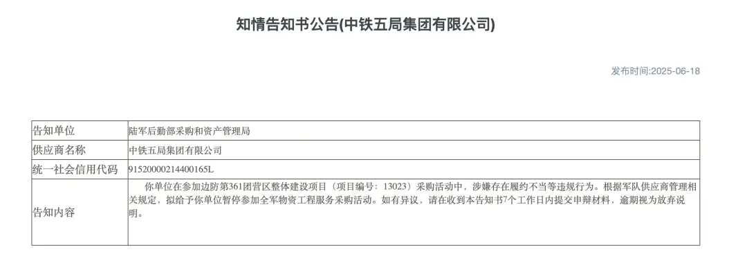 与此同时,2025年6月18日,陆军后勤部采购和资产管理局也曾发布过一则告知书,因涉嫌存在履约不当等违规行为,暂停中铁五局参加全军物资工程服务采购活动。