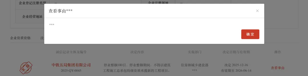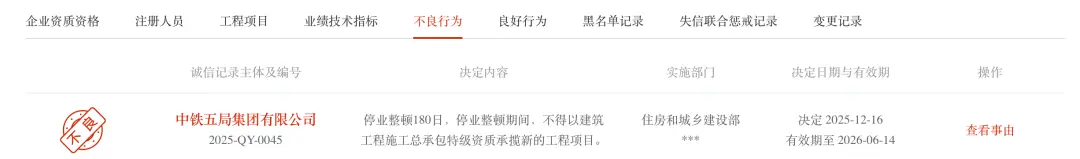 停业整顿期间,中铁五局不得以建筑工程施工总承包特级资质承揽新的工程项目,涉及的具体事由未公开,仅显示“***”,企业资质资格一栏则显示“不良”。
