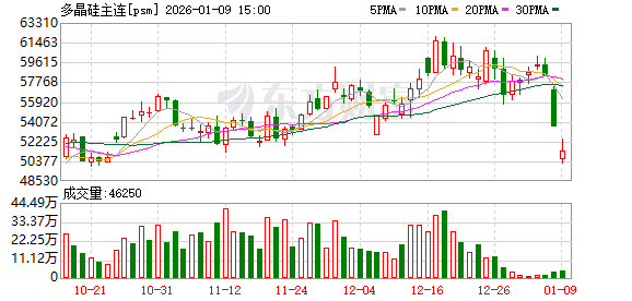 消息传出后,期货与股票市场迅速作出反应,多晶硅主力合约及硅料股全线走低。1月9日,多晶硅期货主力合约遭遇暴跌,较前一交易日结算价重挫4530元,盘中最低触及50080元/吨。