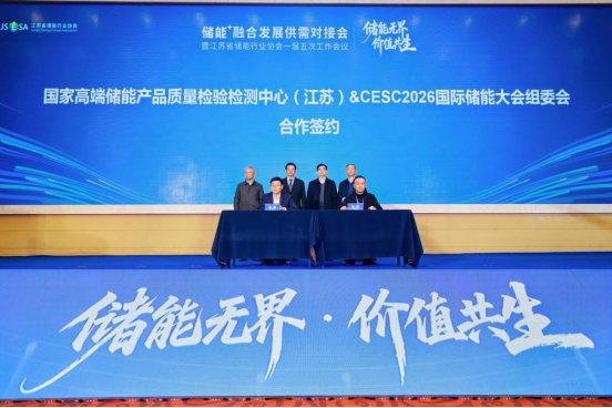 现场还举行了产业供需对接签约仪式。国家高端储能产品质量检验检测中心(江苏)与CESC2026第四届储能大会组委会达成战略合作。此次合作是“权威检测”与“顶级会展平台”的强强联合,双方将围绕大会的展览展示、赛事评审、技术交流等环节开展深度协作,树立行业质量标杆,推广先进技术标准,为产业链上下游提供全链条信任支撑。