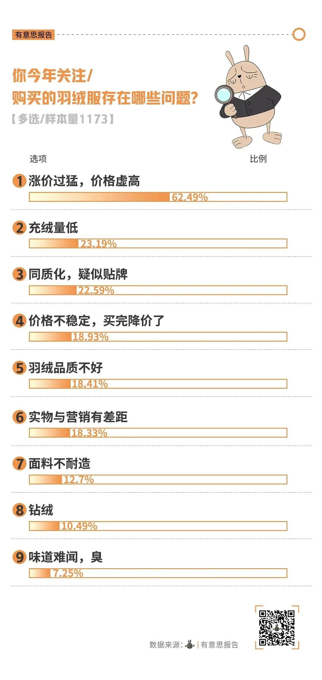 事实上,这并不是李莉一个人的烦恼,有意思报告调查显示,“涨价过猛,价格虚高”是2025年大家购买羽绒服时关注到的主要问题,有超六成消费者选择此项。同时,“充绒量低”和“同质化/疑似贴牌”等问题也高居榜单前列。