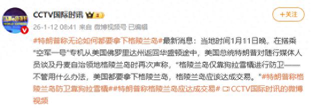 当地时间1月11日晚,在搭乘“空军一号”专机从美国佛罗里达州返回华盛顿途中,美国总统特朗普对随行媒体人员谈及丹麦自治领地格陵兰岛时再次声称,“格陵兰岛仅靠狗拉雪橇进行防卫——不管用什么办法,美国都要拿下格陵兰岛,格陵兰岛应该达成交易。”