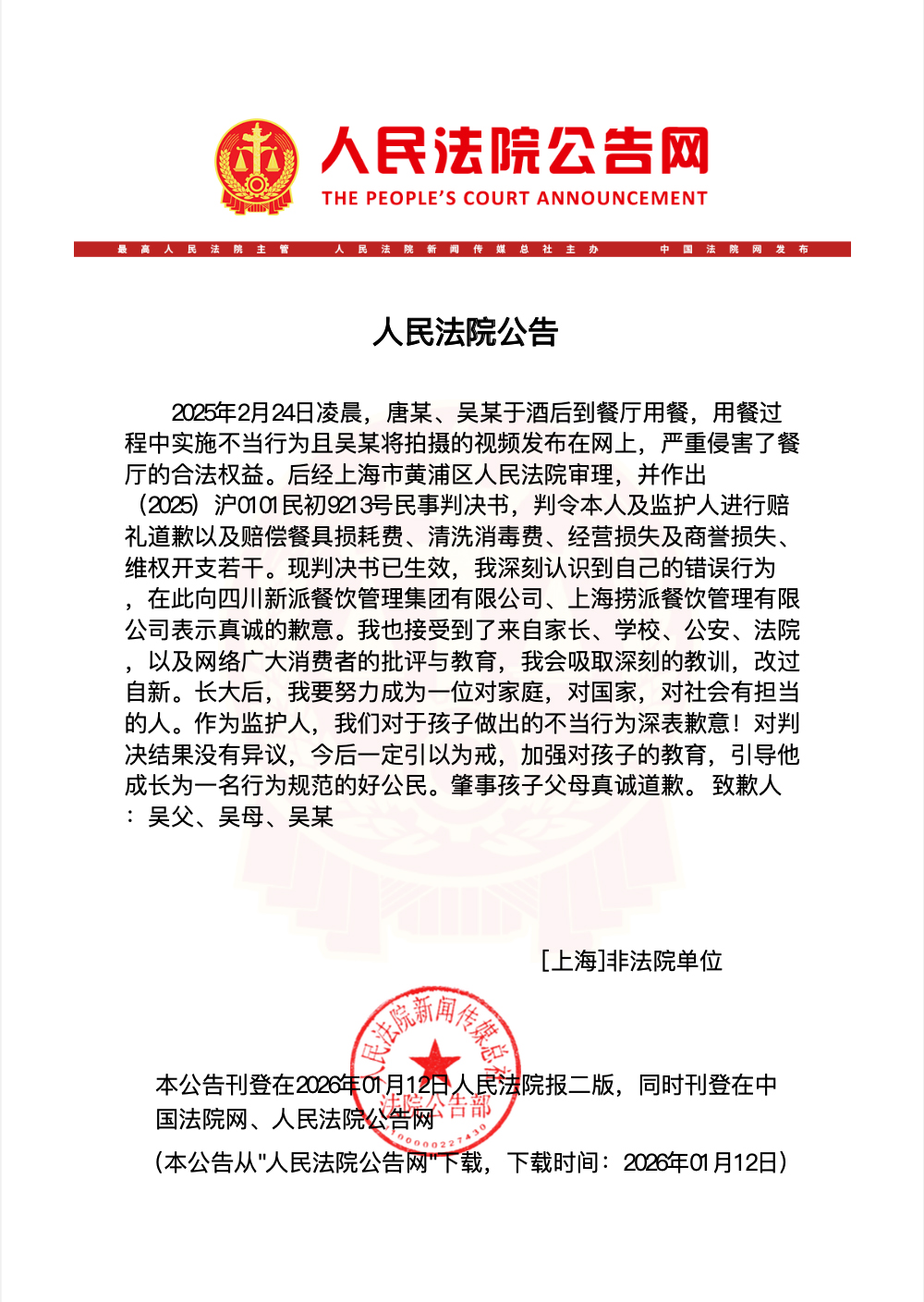 声明显示,2025年2月24日凌晨,唐某、吴某于酒后到餐厅用餐,用餐过程中实施不当行为且吴某将拍摄的视频发布在网上,严重侵害了餐厅的合法权益。后经上海市黄浦区人民法院审理,判令本人及监护人进行赔礼道歉以及赔偿餐具损耗费、清洗消毒费、经营损失及商誉损失、维权开支若干。现判决书已生效。