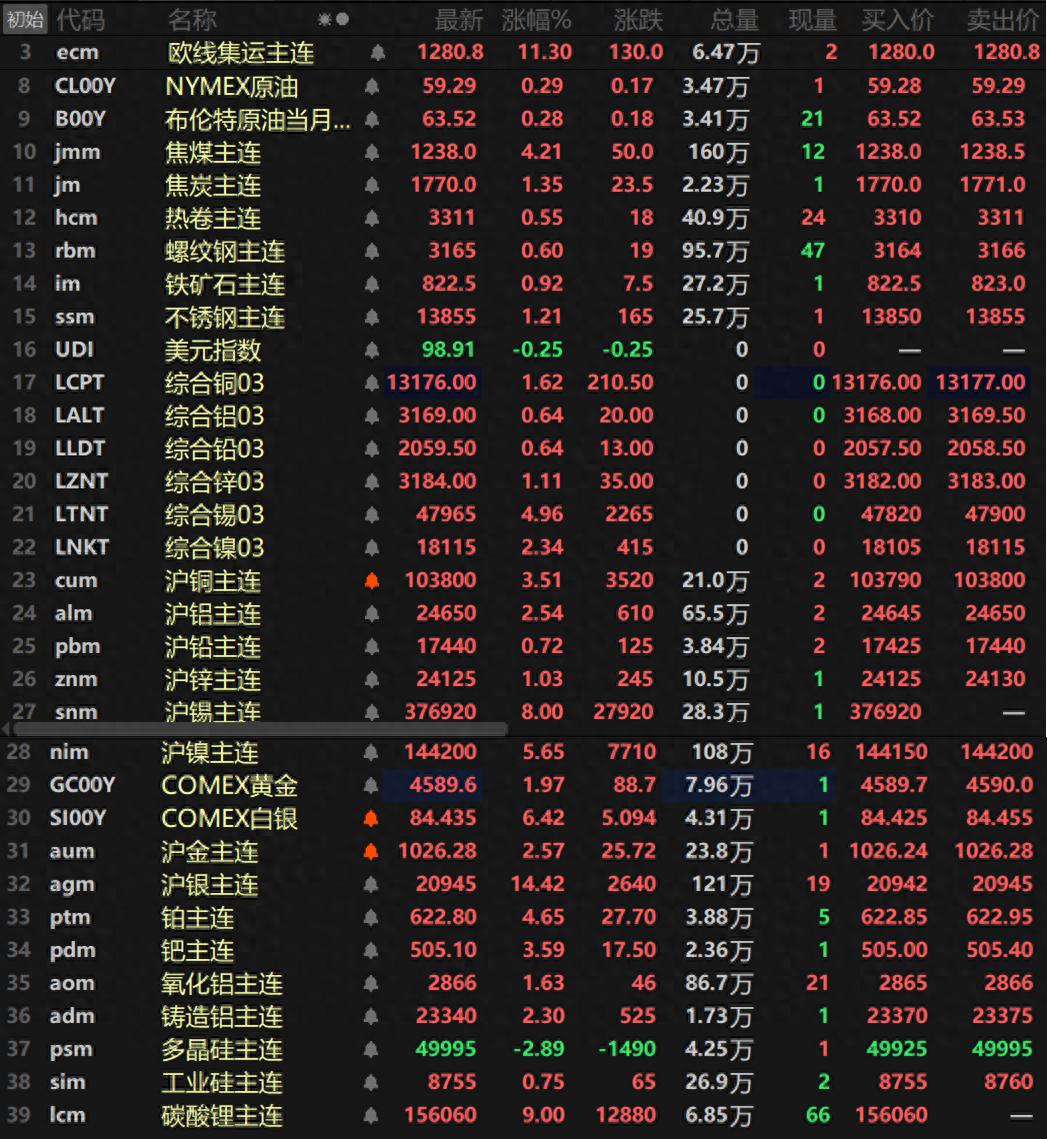 贵金属方面,截至15:03分,COMEX黄金涨1.97%,其盘中最高冲至4612.7美元/盎司,继续刷新其上市以来的历史新高;COMEX白银涨6.42%,其盘中最高触及84.69美元/盎司,同样刷新其上市以来的历史记录;国内方面,沪金涨2.57%,盘中最高触及1031.3元/克,继续刷新其历史记录;沪银大涨14.42%,盘中最高冲至20998元/千克,成功站稳2万元整数关口。