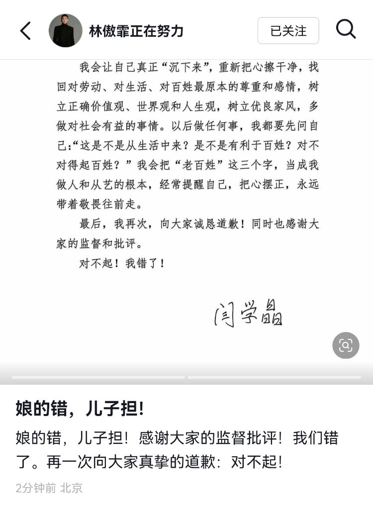 1月12日,闫学晶儿子林傲霏在个人社交账号转发闫学晶的道歉书,并留言“娘的错,儿子担!感谢大家的监督批评!我们错了。再一次向大家真挚的道歉:对不起!”