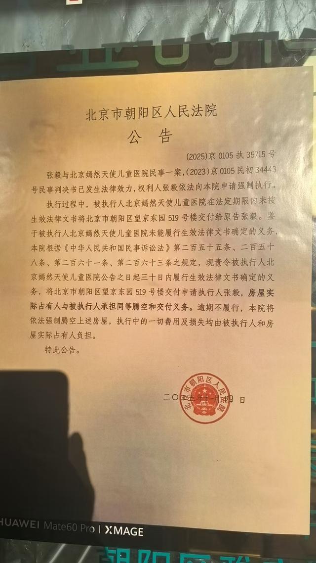 2025年11月4日,北京市朝阳区法院在嫣然医院门口张贴公告,责令医院自公告之日起三十日内履行生效法律文书确定的义务,将北京市朝阳区望京东园519号楼交付申请执行人。