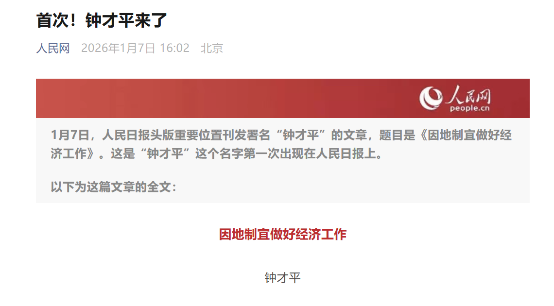 1月7日起,人民日报头版重要位置刊发系列署名“钟才平”的文章,截至1月12日已刊发6篇。这是“钟才平”这个名字第一次出现在人民日报上。