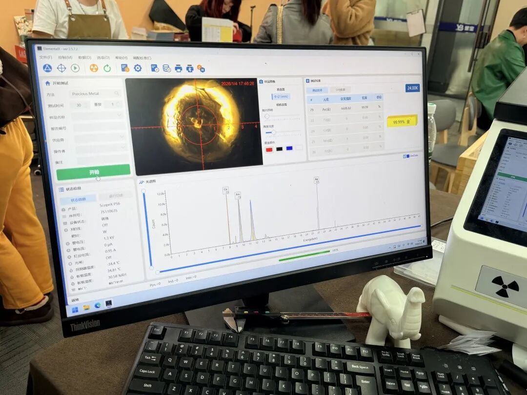 店员使用了专业的贵金属光谱检测仪。工作人员将杨女士的手镯清洁后,放入仪器检测槽。短短几十秒后,电脑屏幕清晰显示出检测结果:黄金(Au)含量达到99.99%,其他元素含量为0,完全符合“足金999.9”的标准。看到屏幕上醒目的“99.99%”,杨女士长舒一口气:“这下彻底放心了,若是按照八折价格售卖,她将被骗2000多元。”