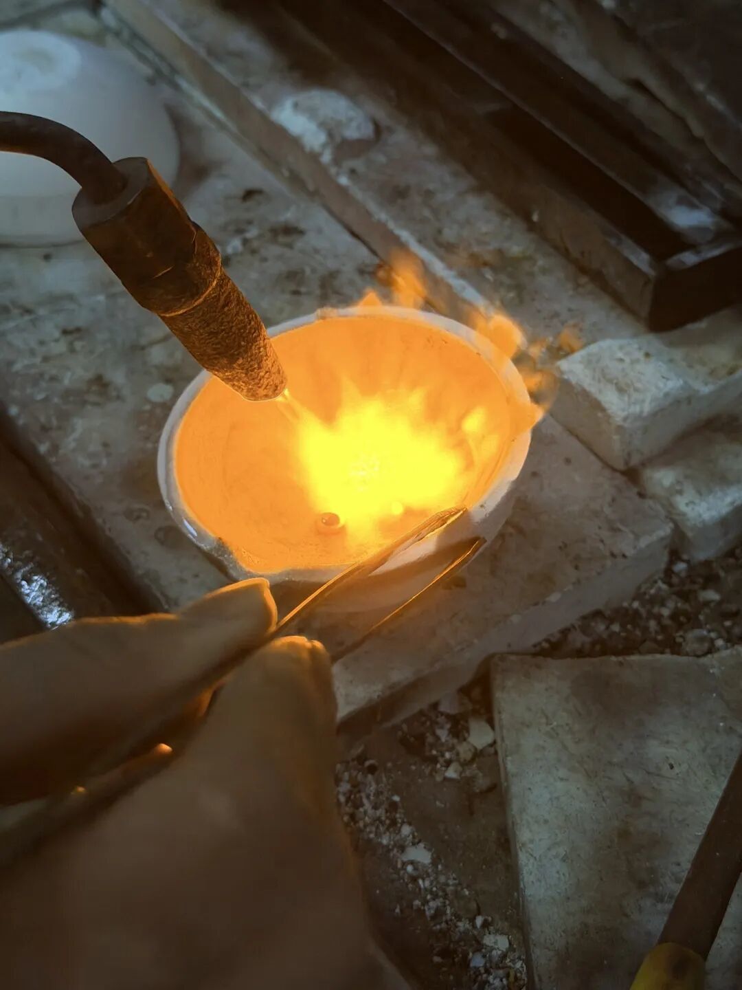 郭志鹏切换成充分燃烧的硬火。火焰为全蓝色,烧黑的真金反而越烧越亮,呈现出黄金的本色。郭志鹏说:“利用软火烧金使其变黑,是不良商家混淆视听的手段之一。”