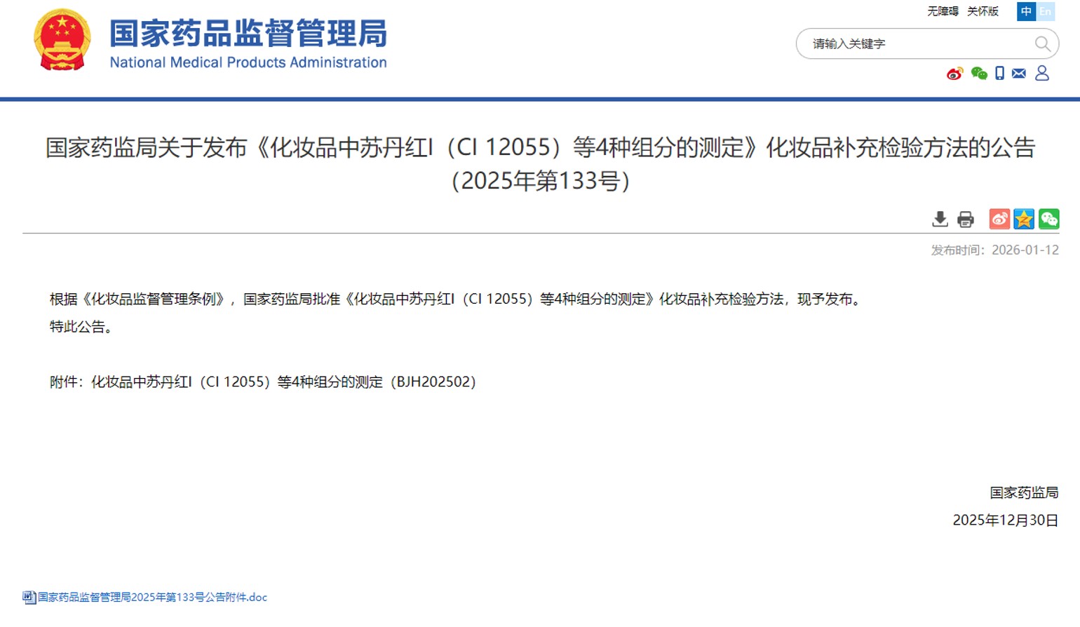 国家药监局近日批准《化妆品中苏丹红I(CI 12055)等4种组分的测定》化妆品补充检验方法,该方法适用于液体(水、油)类、膏霜乳类、粉剂类、块状类、蜡基类化妆品中苏丹红Ⅰ、苏丹红Ⅱ、苏丹红Ⅲ、苏丹红Ⅳ的含量测定。