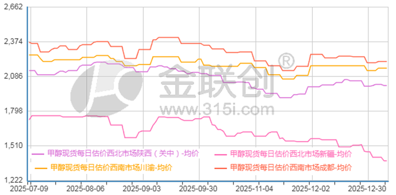 进入12月后,川渝地区企业开工率维持在34%左右,2026年1月份开工率最低降至21%(1月4日至今),区域供应降至低位。但从金联创价格数据来看,川渝甲醇价格并未出现明显走强情况,从2025年12月份以来,持续波动在2070-2280元/吨价格区间附近,2026年1月初更是出现短暂小幅下行现象。