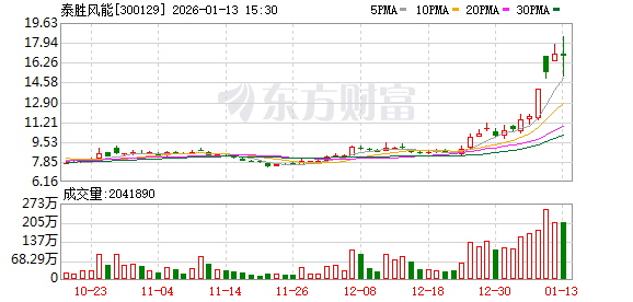 受跨界航天业务预期影响,公司股价近期表现活跃。截至1月12日收盘,泰胜风能股价当日上涨10.68%,报17元/股,创下历史新高,近一个月累计涨幅近90%,总市值158.93亿元。
