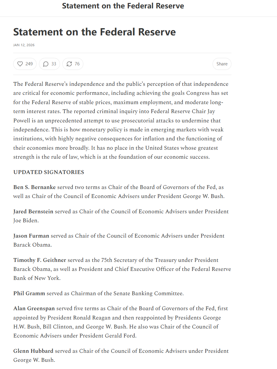 1月12日,包括艾伦·格林斯潘(Alan Greenspan)、本·伯南克(Ben Bernanke)和珍妮特·耶伦(Janet Yellen)在内的三位美联储前主席,以及多位前财政部长和知名经济学家发表联合声明,谴责此举是“利用检方调查削弱美联储独立性的前所未有之举”。