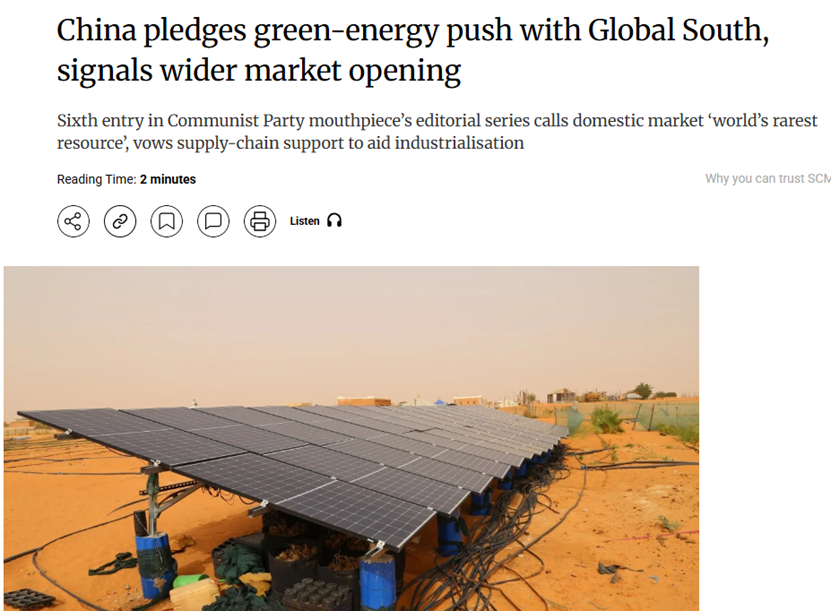《南华早报》提到,过去十年,中国已通过其大规模可再生能源系统降低了全球太阳能电力成本,帮助全球降低了太阳能电力成本80%以上;中国企业在非洲建设的太阳能电池板和微电网项目为当地社区提供了电力,并“显著节省了能源进口支出,为发展和社会福利提供了资金”。
