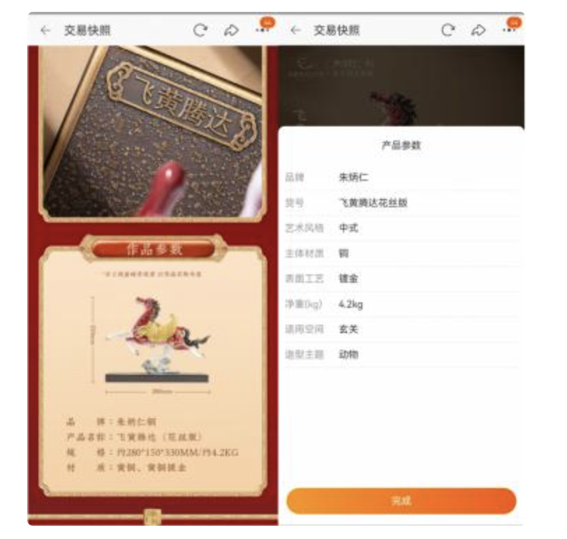 消费者姜女士告诉泰山财经,去年11月,她在淘宝朱炳仁官方旗舰店下单购买名为“飞黄腾达”的铜马摆件。姜女士展示的商品交易快照显示,对该产品的规格描述为重4.2公斤、长宽高约为280*10*330MM。