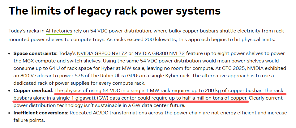 据此前英伟达的一篇技术论文,其在介绍自己的800VDC高压直流电架构时曾指出,传统架构中,单个1兆瓦机架需要重达200公斤的铜母线,单个1吉瓦的机架则需要高达50万吨的铜。