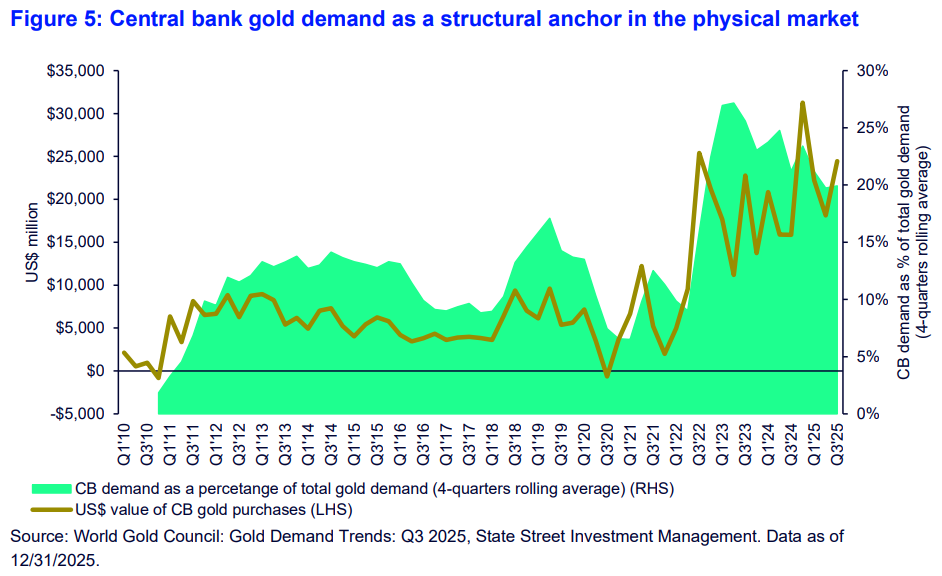私人投资者这种“奔向优质资产”的避险与通胀对冲行为,正与央行对黄金需求高度无弹性的特性形成互补。与此同时,出于战略原因和多元化需求,储备管理机构也正继续不计价格地购入黄金。