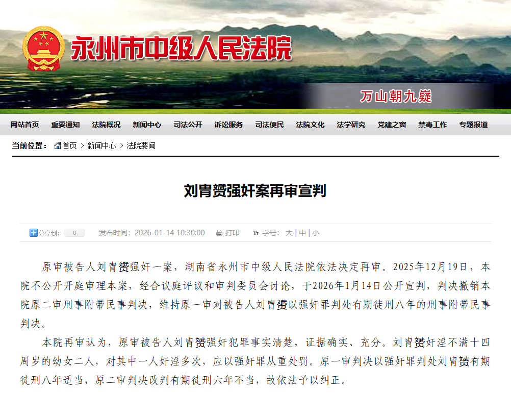 央视网消息:据湖南省永州市中级人民法院消息,原审被告人刘胄赟强奸一案,湖南省永州市中级人民法院依法决定再审。2025年12月19日,本院不公开开庭审理本案,经合议庭评议和审判委员会讨论,于2026年1月14日公开宣判,判决撤销本院原二审刑事附带民事判决,维持原一审对被告人刘胄赟以强奸罪判处有期徒刑八年的刑事附带民事判决。