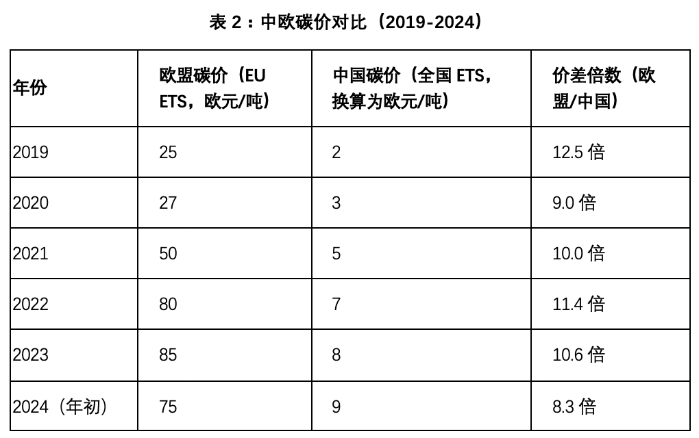 数据来源: 欧盟碳价来自洲际交易所(ICE);中国碳价来自上海环境能源交易所,按当年平均汇率换算。