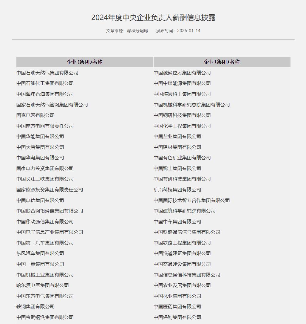 据新华社消息,1月14日,国务院国资委网站通过提供各中央企业薪酬信息披露网页链接的方式,披露了所监管的80多家央企负责人2024年度薪酬信息。这是国资央企持续抓好重点领域信息公开、回应公众关心关切的重要举措。