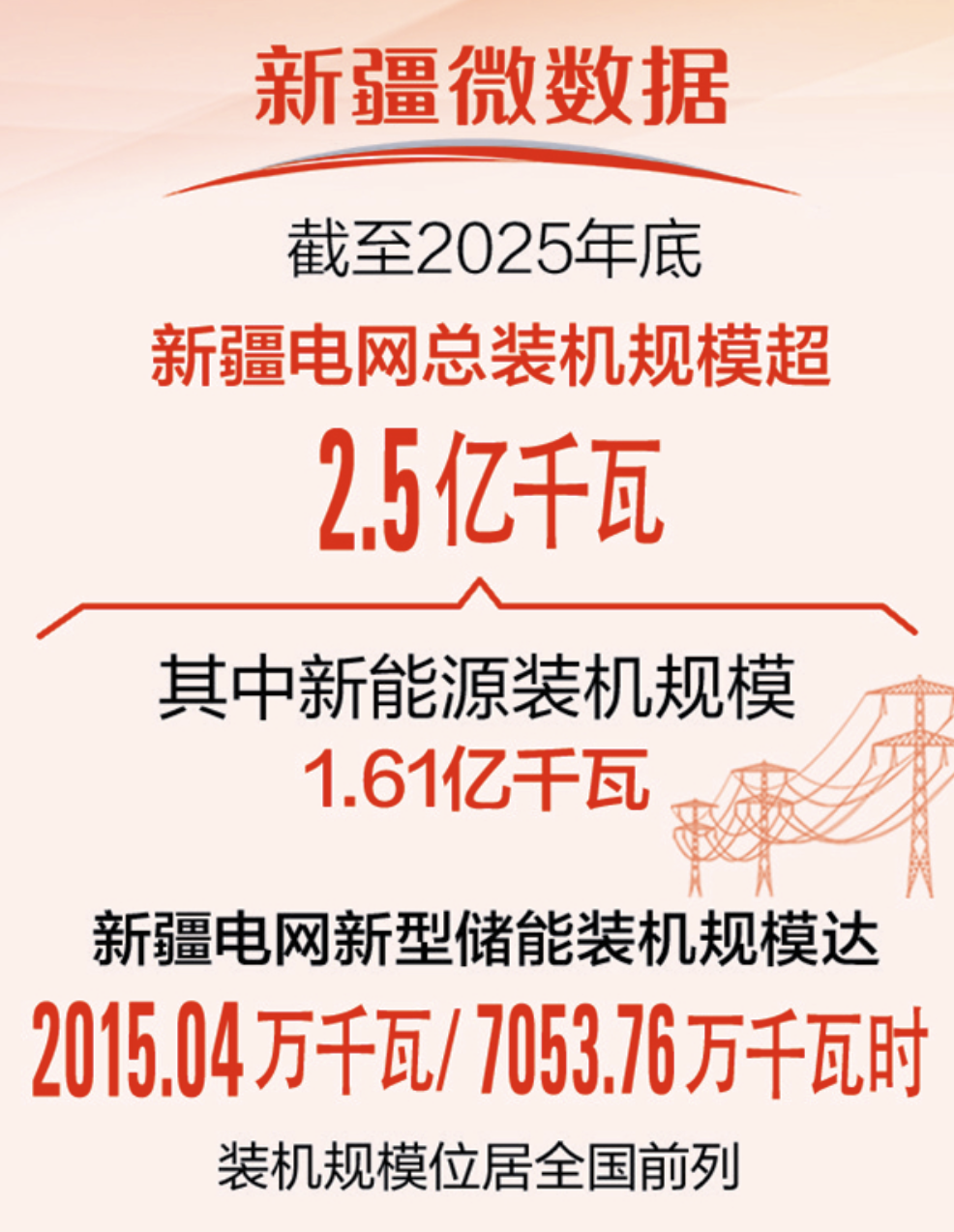 作为国家重要的能源资源战略保障基地,新疆清洁能源开发步伐持续加快。截至2025年底,新疆电网总装机规模超2.5亿千瓦,其中新能源装机规模1.61亿千瓦,已建成6个千万千瓦级新能源基地,新能源装机规模占新疆电网总装机规模比重持续提升,清洁能源供给能力稳步增强。