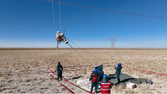 1月10日,青海柴达木盆地,海拔2800米,寒气裹挟。在纵贯高原戈壁荒漠的750千伏柴鱼Ⅱ线上,一个身影悬停在三十多米的高空。带电作业人员张杨,身着全套屏蔽服,如“特种兵”般全神贯注。他手握电位转移棒,目光锁定眼前滋滋作响、承载着数十万伏特高压的导线。