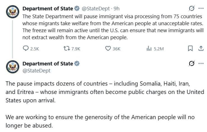 据报道,美国国务院在社交媒体上发布消息称,这一暂停措施将影响数十个国家,包括索马里、海地、伊朗和厄立特里亚等。
