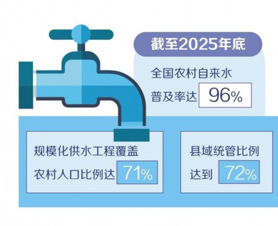 农村供水事关亿万百姓的福祉。近年来,水利部门在充分调研和总结地方经验的基础上,创新提出农村供水“3+1”标准化建设和管护模式。“3”是指优先推进城乡供水一体化建设,大力推进集中供水规模化建设,因地制宜实施小型供水工程规范化建设和改造;“1”是指积极推进县域统管和专业化管护。截至2025年底,全国农村自来水普及率达96%,规模化供水工程覆盖农村人口比例达71%,县域统管比例达到72%。