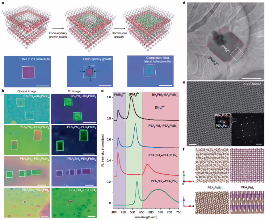 相比之下,二维钙钛矿薄层单晶在晶格完整性、缺陷密度和界面可控性方面具有天然优势,被视为突破上述瓶颈的理想平台。然而,如何在二维钙钛矿单晶中实现高质量、可控外延的横向异质结图案化,同时保持界面原子级平整与晶格连续性,长期以来仍是该领域面临的关键科学挑战。