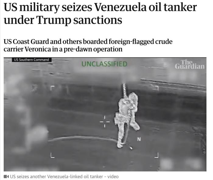 据英国《卫报》报道,当地时间15日,美军方面宣布,美国在加勒比海扣押了又一艘油轮。