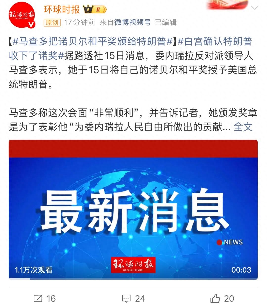 据环球时报援引路透社15日消息,委内瑞拉反对派领导人马查多表示,她于15日将自己的诺贝尔和平奖授予美国总统特朗普。马查多称这次会面“非常顺利”,并告诉记者,她颁发奖章是为了表彰他“为委内瑞拉人民自由所做出的贡献”。