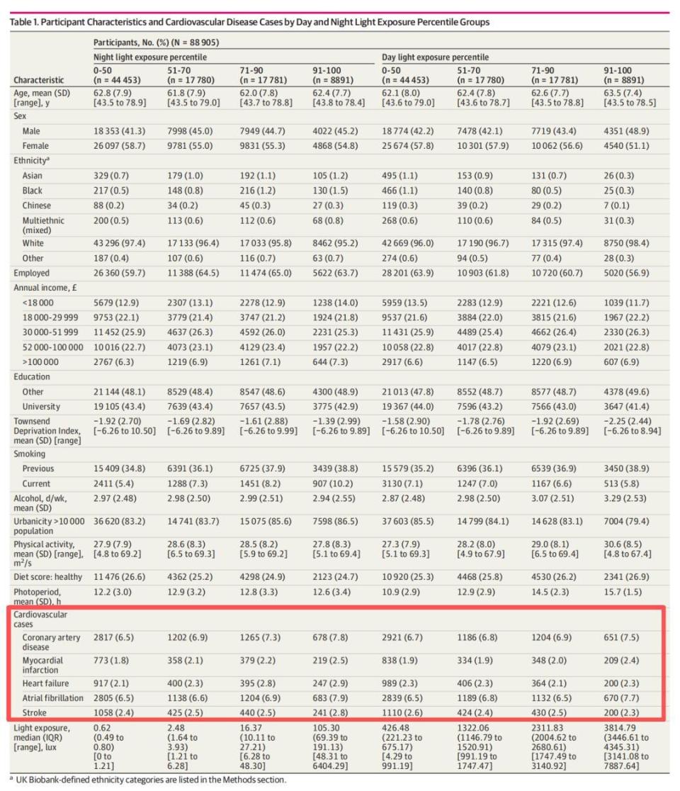 具体来说,和那些在黑暗环境中睡觉的人相比,夜里最亮的那一组人:心力衰竭的风险增加了45%心肌梗死的风险增加了42%房颤的风险增加了28%冠心病的风险增加了23%中风(脑卒中)的风险增加了28%