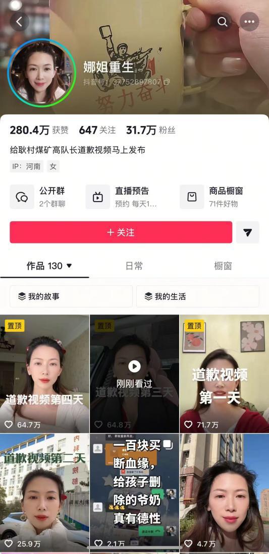 1月12日至今,牛娜连续4天发布道歉视频,引发网友围观,目前其抖音账号粉丝已超过31万,最新道歉视频获得超过60万人点赞。据牛娜在视频中公开的内容,被道歉方长期在耿村煤矿工作。