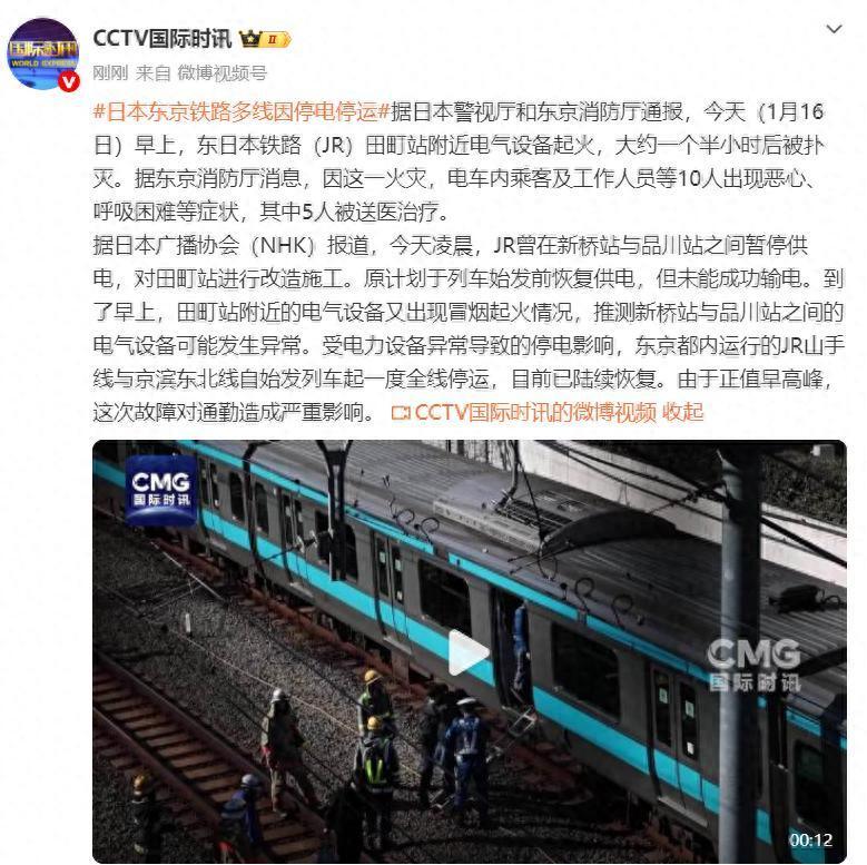 据日本警视厅和东京消防厅通报,今天(1月16日)早上,东日本铁路(JR)田町站附近电气设备起火,大约一个半小时后被扑灭。据东京消防厅消息,因这一火灾,电车内乘客及工作人员等10人出现恶心、呼吸困难等症状,其中5人被送医治疗。