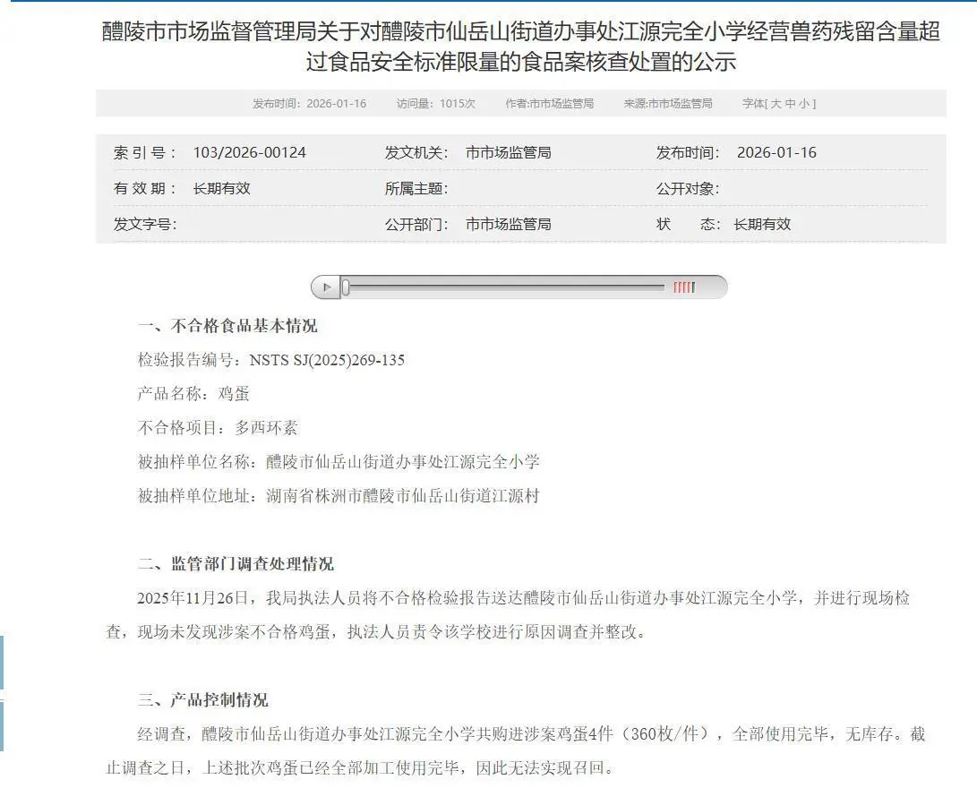 上述公告显示,2025年11月26日,醴陵市市场监督管理局执法人员将不合格检验报告送达醴陵市仙岳山街道办事处江源完全小学,并进行现场检查,现场未发现涉案不合格鸡蛋,执法人员责令该学校进行原因调查并整改。