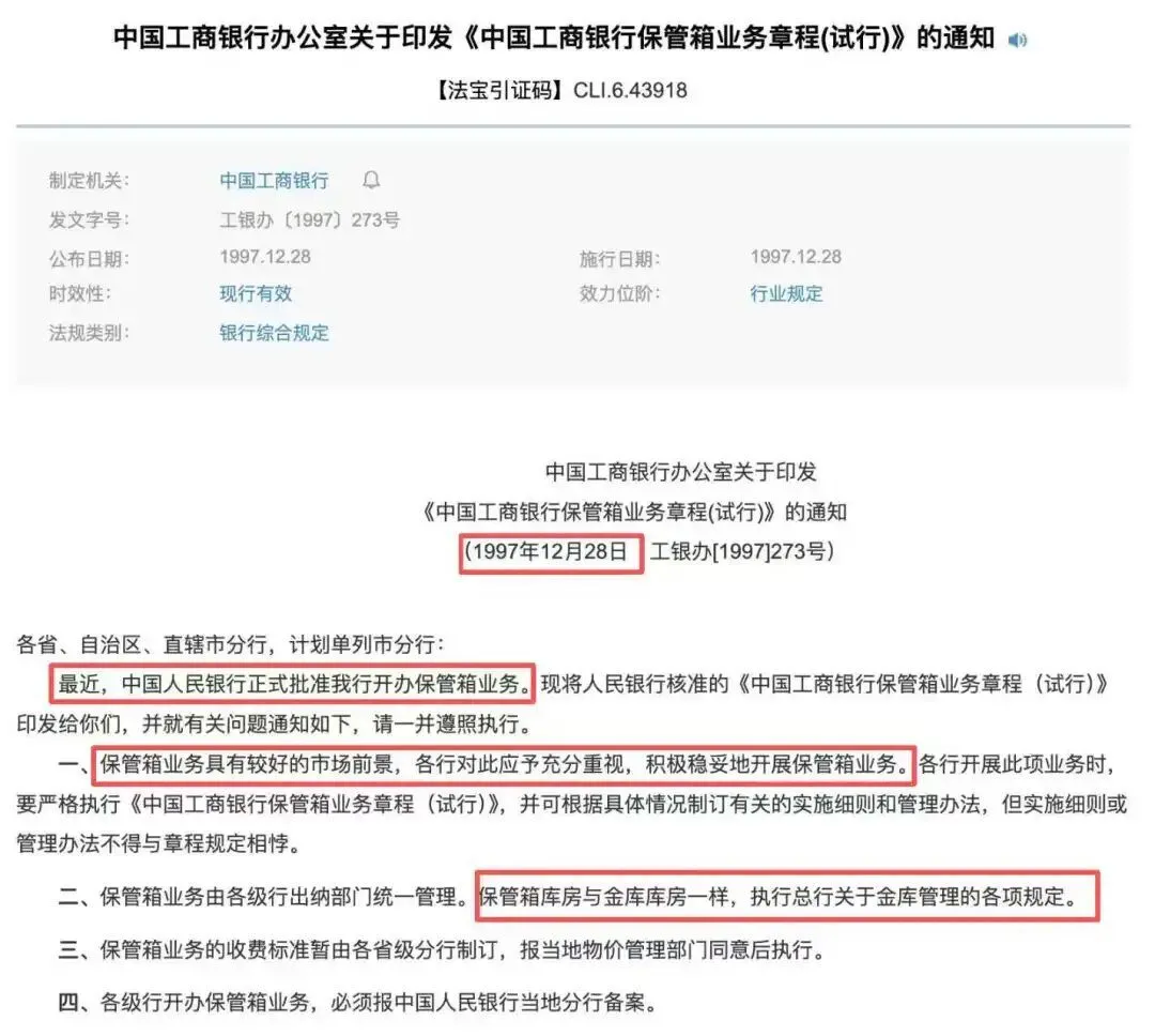 根据北大法宝信息,尚未进行改制的工商银行曾于1997年发布关于印发《中国工商银行保管箱业务章程(试行)》的通知。该通知显示,中国人民银行于当年正式批准其开办保管箱业务。工行在这一通知中指出:“保管箱业务具有较好的市场前景,各行对此应予充分重视,积极稳妥地开展保管箱业务。”同时,“保管箱库房与金库库房一样,执行总行关于金库管理的各项规定。”